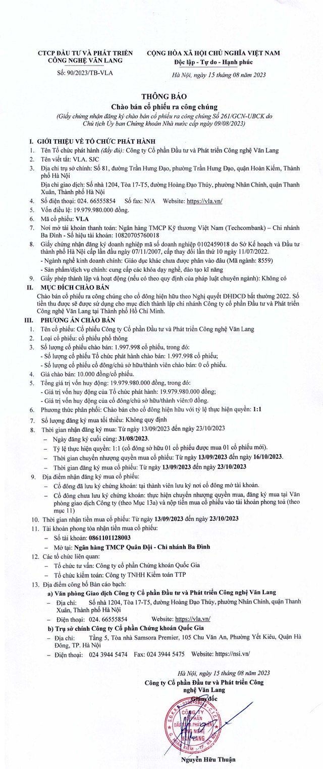 CTCP Đầu tư và Phát triển Công nghệ Văn Lang (VLA) thông báo chào bán cổ phiếu ra công chúng