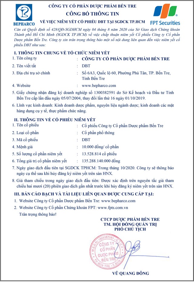 CTCP Dược phẩm Bến Tre công bố thông tin về việc niêm yết cổ phiếu DBT tại HOSE