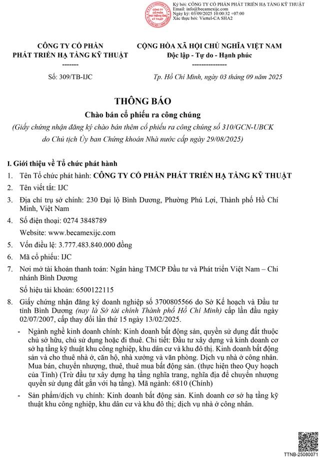 CTCP Phát triển Hạ tầng Kỹ thuật (IJC) thông báo chào bán cổ phiếu ra công chúng (kỳ 3)