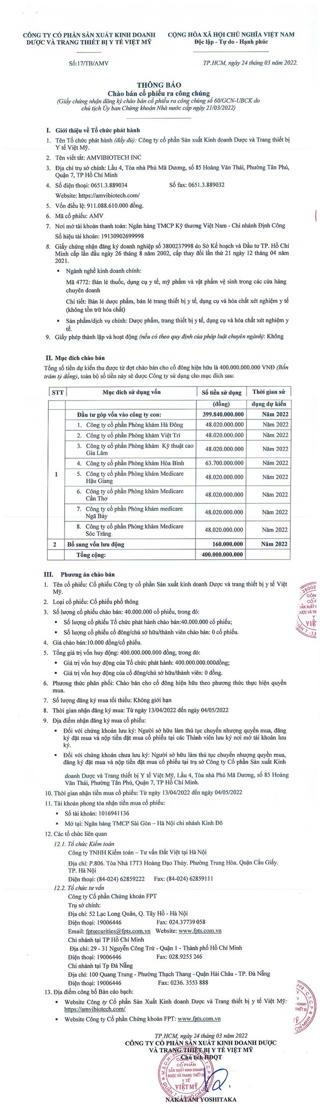 CTCP Sản xuất kinh doanh dược và Trang thiết bị y tế Việt - Mỹ thông báo chào bán cổ phiếu ra công chúng