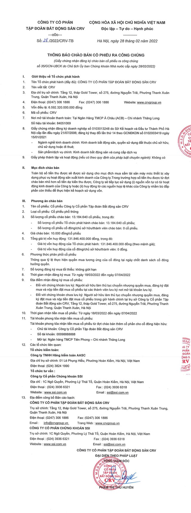CTCP Tập đoàn Bất động sản CRV thông báo chào bán cổ phiếu ra công chúng