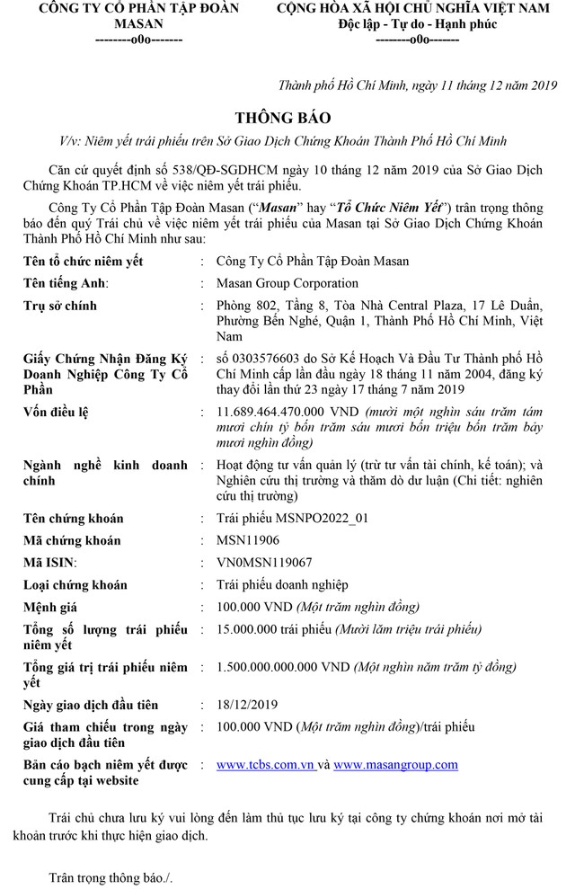 CTCP Tập đoàn Masan thông báo niêm yết trái phiếu trên Sở GDCK TP.HCM