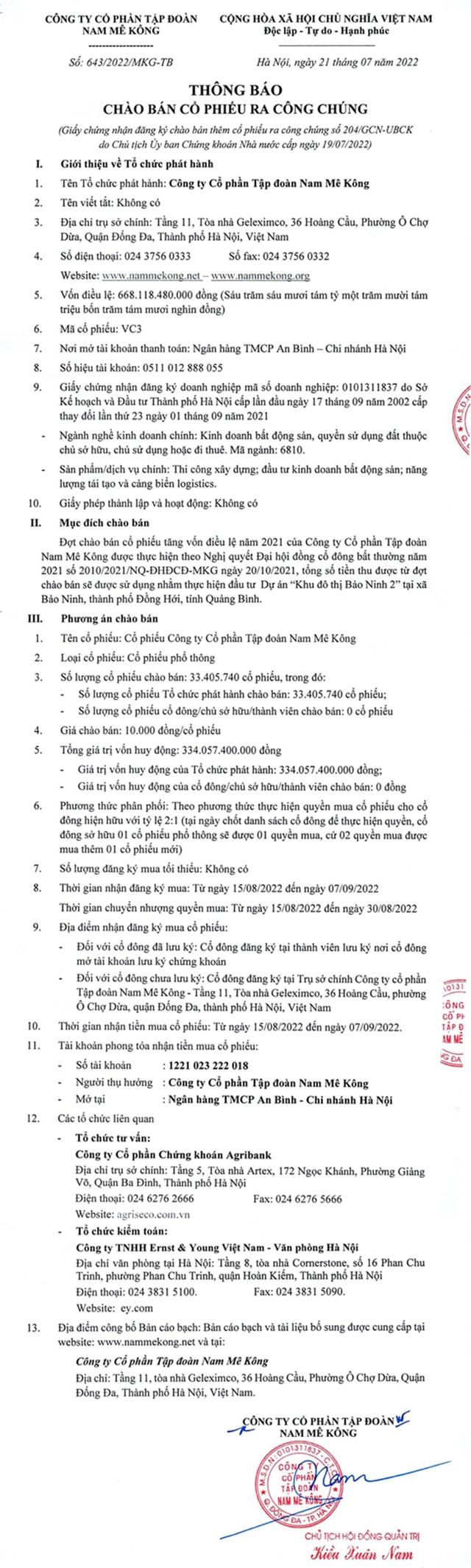 CTCP Tập đoàn Nam Mê Kông (VC3) thông báo chào bán thêm cổ phiếu ra công chúng