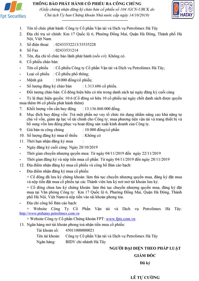 CTCP Vận tải và Dịch vụ Petrolimex Hà Tây thông báo phát hành cổ phiếu ra công chúng
