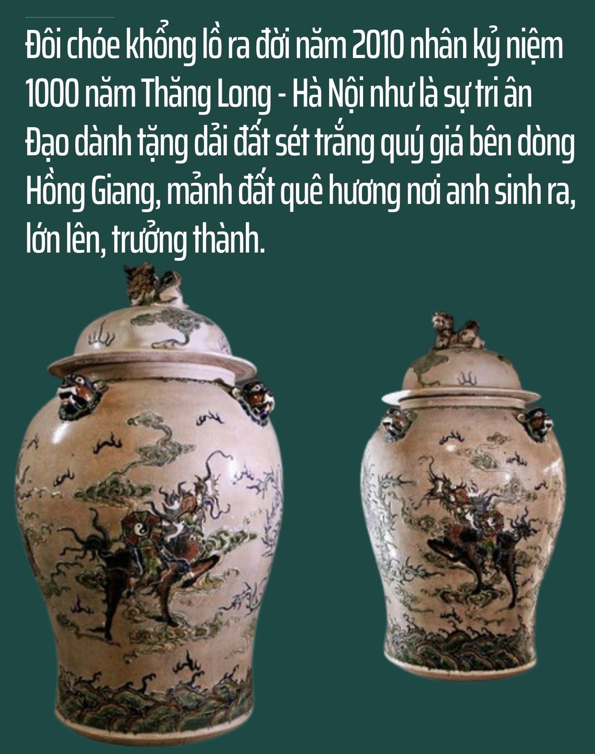 Đôi chóe khổng lồ ra đời năm 2010 nhân kỷ niệm 1000 năm Thăng Long - Hà Nội như là sự tri ân Đạo dành tặng dải đất sét trắng quý giá bên dòng Hồng Giang, mảnh đất quê hương nơi anh sinh ra, lớn lên, trưởng thành. Các họa tiết vẽ tứ linh (long, lân, quy, phượng) trên chóe được nghệ nhân vẽ lại, dựa trên các họa tiết gốm truyền thống với nước men rạn theo kiểu giả cổ để những lớp thế hệ sau này mường tượng tinh hoa gốm Bát Tràng.