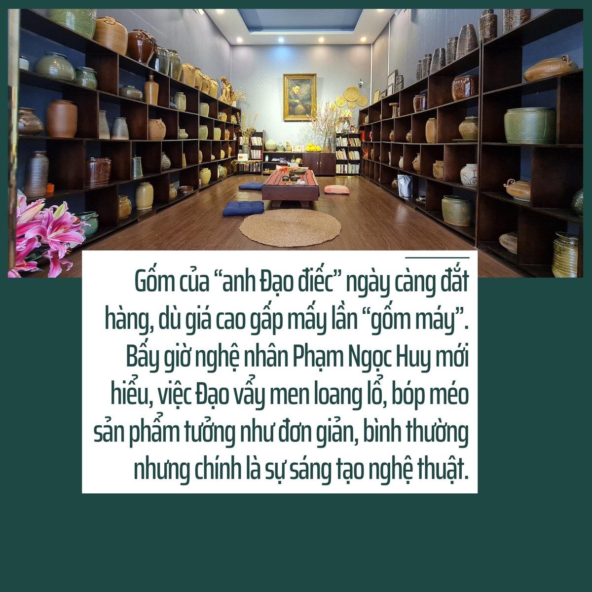Gốm của “anh Đạo điếc” ngày càng đắt hàng, dù giá cao gấp mấy lần “gốm máy”. Bấy giờ nghệ nhân Phạm Ngọc Huy mới hiểu, việc Đạo vẩy men loang lổ, bóp méo sản phẩm tưởng như đơn giản, bình thường nhưng chính là sự sáng tạo nghệ thuật.