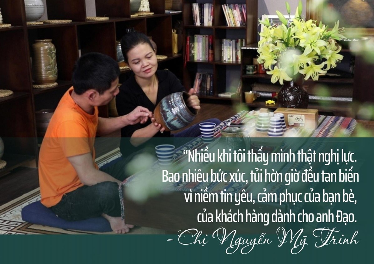 Đưa ánh mắt trìu mến nhìn chồng đang mải mê bên bàn xoay, mặc cho những giọt mồ hôi thỉnh thoảng nhỏ xuống, thấm vào khối đất sét trong tay, chị bảo: “Anh Đạo tuyệt nhiên không quan tâm tới việc định giá, khách đến còn biếu, tặng chứ không bán. Anh ấy là một nghệ sỹ đích thực. Trước đây, gốm thủ công gần như chỉ có các nghệ sỹ hoặc giới sưu tầm đồ cổ quan tâm, việc mở rộng thị trường không hề dễ dàng. Nhưng tôi luôn vững tin rằng, mọi người cũng sẽ như mình, sẽ trân quý những sản phẩm chứa đựng tâm huyết và cảm xúc của anh Đạo”.