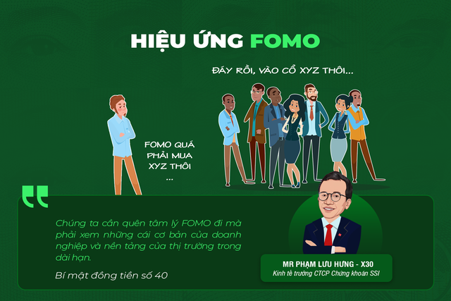 FOMO, viết tắt của cụm từ Fear Of Missing Out – Sợ bỏ lỡ cơ hội, có lẽ là hiệu ứng tâm lý nổi tiếng nhất và cũng là hành động mà nhiều nhà đầu tư từng mắc phải. Ông Phạm Lưu Hưng, Kinh tế trưởng SSI, hay còn biết đến là Mr.X30, khách mời chuyên môn của chương trình giải thích đơn giản với khán giả về hiệu ứng tâm lý phổ biến này: “Đối với nhiều người mang tâm lý FOMO thì cổ phiếu tăng giá mạnh nhất chính là cổ phiếu mình định mua hoặc cổ phiếu mình vừa bán. Chính vì tâm lý đó nên họ sẽ mua lại những cổ phiếu mình vừa “bán tháo”.