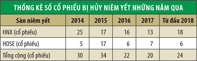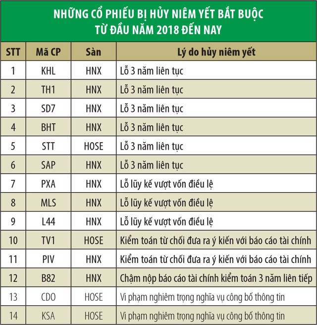 Thống kê sơ bộ cho thấy, trên hai Sở giao dịch chứng khoán trong 10 tháng đầu năm 2018, có tổng cộng 14 doanh nghiệp bị hủy niêm yết bắt buộc.