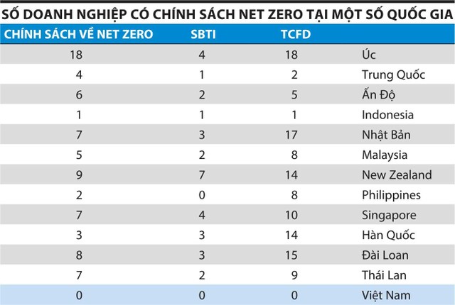 Nhóm 20 công ty niêm yết hàng đầu tại Việt Nam cần đẩy mạnh việc áp dụng các chính sách về môi trường. Nhóm 20 công ty niêm yết hàng đầu tại một số nước ở khu vực đã tích cực hưởng ứng việc thực hiện các chính sách cắt giảm khí thải (xem bảng).