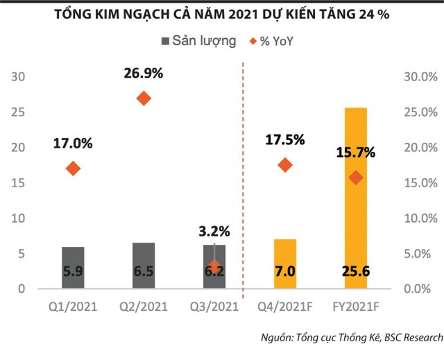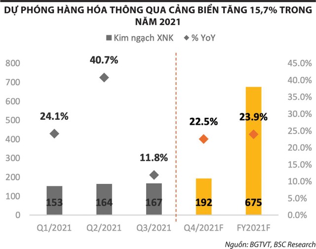 Trong quý IV/2021, Công ty Chứng khoán BSC dự báo, sản lượng hàng hóa thông qua các cảng sẽ tăng từ 15 - 20% so với cùng kỳ, giúp cho tổng sản lượng cả năm đạt mức 25,6 triệu TEU, tăng 15,7% nhờ những hạn chế trong sản xuất, lưu thông hàng hóa được nới lỏng.