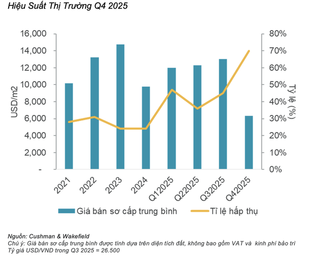 Giá bán sơ cấp trung bình trong quý IV/2025 đạt khoảng 6.113 USD/m2, tăng khoảng 16% so với quý III/2025 và tăng khoảng 65% so với cùng kỳ năm 2024, do các dự án mới luôn có định vị cao hơn dự án cũ.
