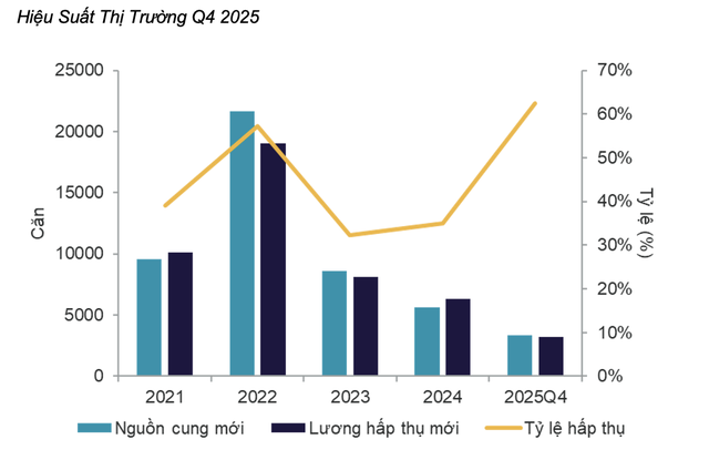Trong quý IV/2025, thị trường ghi nhận lượng hấp thụ mới khoảng 3.196 căn, tăng 19% so với quý trước và tăng khoảng 10% so với cùng kỳ năm trước. Lượng giao dịch mới gần như tương đương nguồn cung mở bán, trong khi tỷ lệ hấp thụ tăng mạnh lên mức cao nhất trong năm 2025 (khoảng 62%).