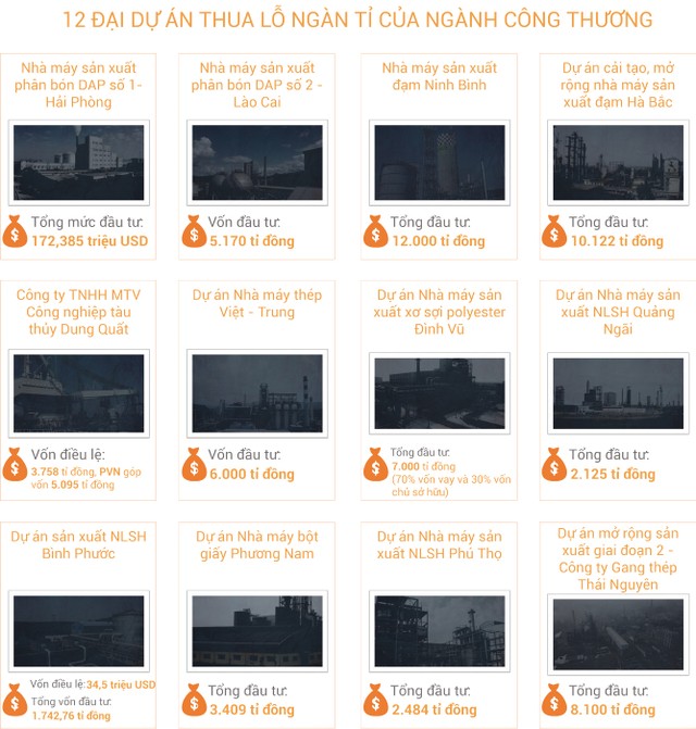 Dư luận vẫn không ngớt lo ngại về những khó khăn, bế tắc của 12 dự án thua lỗ ngành công thương. Những dự án này đã và đang gây thất thoát hàng nghìn tỷ đồng vốn nhà nước, để lại hậu quả kéo dài. Có dự án trong số này đã mấp mé bờ vực phá sản, tồn tại lay lắt. Đáng lo ngại hơn là sự phá sản này có thể kéo sập cả tập đoàn chủ quản, gây thiệt hại lớn cho khu vực DNNN cũng như toàn bộ nền kinh tế, như trường hợp Nhà máy Đạm Ninh Bình thuộc Tập đoàn Hóa chất Việt Nam.