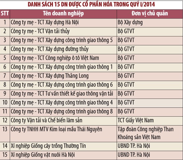 Tại cuộc họp báo thường kỳ quý I/2014 của Bộ Tài chính vừa diễn ra, ông Phạm Văn Đức, Phó Cục trưởng Cục Tài chính doanh nghiệp, Bộ Tài chính, cho biết, trong quý I/2014, cả nước cổ phần hóa (CPH) được 15 DN (xem bảng). Trong đó, hầu hết là các công ty mẹ - tổng công ty trực thuộc các bộ, riêng Bộ Giao thông Vận tải (GTVT), CPH được 10 công ty mẹ - tổng công ty.