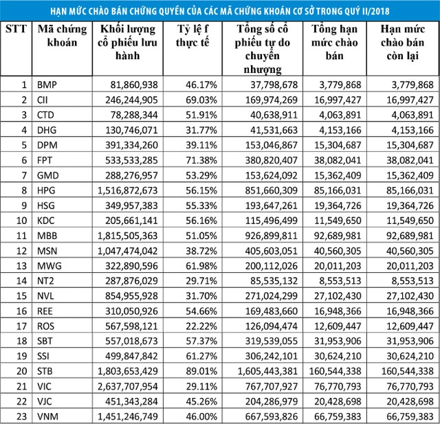 HOSE vừa công bố danh sách cổ phiếu đáp ứng điều kiện là chứng khoán cơ sở của chứng quyền và hạn mức còn được phép chào bán trong quý II/2018, áp dụng từ ngày 11/5/2018, với 23 mã chứng khoán cơ sở.