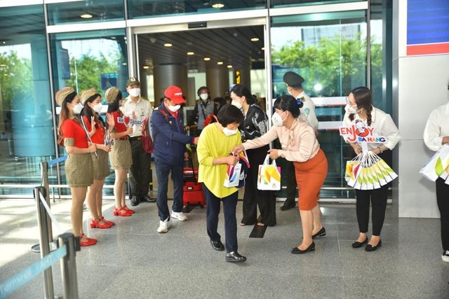 Ngoài những bó hoa dành tặng cho 20 vị khách đầu tiên, mỗi hành khách trên chuyến bay VJ879 được du lịch Đà Nẵng nhận được những phần quà lưu niệm ý nghĩa với móc khóa, ấn phẩm du lịch, bánh khô mè đặc sản và bộ sản phẩm khẩu trang, gel sát khuẩn tay để có một chuyến du lịch an toàn và trọn vẹn.