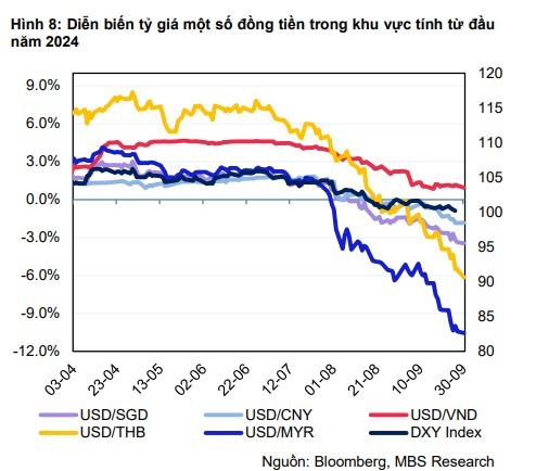 Tuy vậy, Fed đã gây ngạc nhiên khi mạnh tay cắt giảm lãi suất chủ chốt 50 điểm cơ bản, nhằm bảo vệ nền kinh tế khỏi suy thoái trong bối cảnh rủi ro gia tăng đối với thị trường lao động. Sau quyết định này, chỉ số DXY liên tục trượt dốc và kết thúc tháng 9 ở mức 100,2. MBS cho rằng, với nền kinh tế hiện đang trong trạng thái cân bằng và lạm phát đang tiến gần tới mục tiêu 2%, các nhà hoạch định chính sách của Fed đã phát tín hiệu về khả năng sẽ có thêm hai lần cắt giảm lãi suất trong năm nay, nhưng mức giảm nhỏ hơn với 25 điểm cơ bản.
