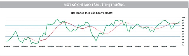 Bên cạnh đó, sự trở lại mạnh mẽ của thị trường còn được ghi nhận trên chỉ báo định lượng, khi đường đà lan tỏa ngắn hạn tăng trở lại và vượt lên trên đường MA10 của chính nó. Điều này được ghi nhận rất rõ khi nhóm vốn hóa lớn và ngân hàng đóng vai trò dẫn dắt trong các phiên giao dịch đầu tuần. Dù có sự chậm lại, điều chỉnh trong phiên cuối tuần, nhưng sự vận động của nhóm chỉ là điều chỉnh với khối lượng nhỏ. Do đó, việc điều chỉnh của nhóm cổ phiếu ngân hàng vẫn đang được đánh giá là lành mạnh. Mặt khác, nhóm này đã làm rất tốt vai trò dẫn dắt chỉ số về đỉnh ngắn hạn cũ trong suốt nhịp tăng 3 tháng vừa qua và có lẽ cũng cần đến lúc tạm nghỉ ngơi.