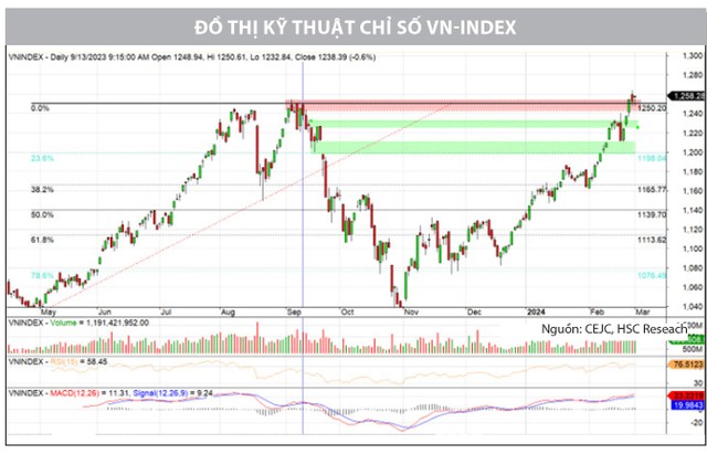 Sau diễn biến rung lắc tuần trước đó, VN-Index đã nhanh chóng nối dài đà tăng trong tuần vừa qua. Khép lại tuần giao dịch, chỉ số ghi nhận tăng điểm mạnh và đóng cửa tại mức cao nhất kể từ tháng 9/2022 dưới sự luân chuyển dòng tiền nhịp nhàng từ các nhóm cổ phiếu. Ở góc nhìn kỹ thuật, trên cả khung đồ thị tuần và ngày, VN-Index đều đang duy trì trạng thái tăng điểm tích cực và điểm nhấn chính là chỉ số đóng cửa trên mức đỉnh tháng 9/2023. Thanh khoản duy trì trên mức bình quân 20 phiên, cho thấy dòng tiền tiếp tục chảy đều và luân chuyển mạnh vào thị trường khi niềm tin của nhà đầu tư về xu hướng tích cực vẫn đang được củng cố. Theo đó, dư địa tăng của VN-Index dần được mở rộng và có khả năng sẽ kéo dài hơn nữa với mức mục tiêu tiếp theo tại 1.285 - 1.300 điểm.