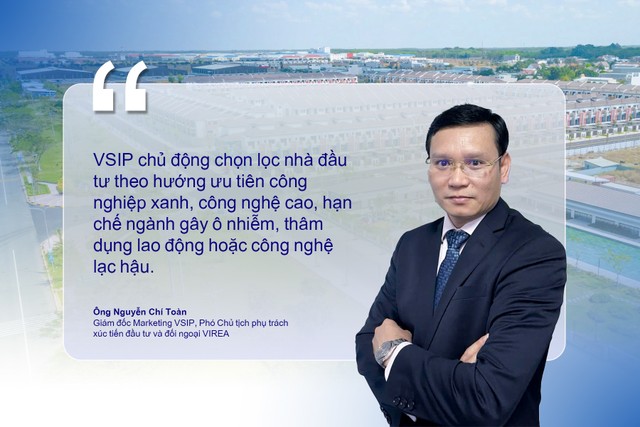 Trong tiếp thị, chúng tôi có lợi thế lớn nhờ mạng lưới toàn cầu được xây dựng hàng chục năm. Đồng thời, VSIP chủ động chọn lọc nhà đầu tư theo hướng ưu tiên công nghiệp xanh, công nghệ cao, hạn chế ngành gây ô nhiễm, thâm dụng lao động hoặc công nghệ lạc hậu.