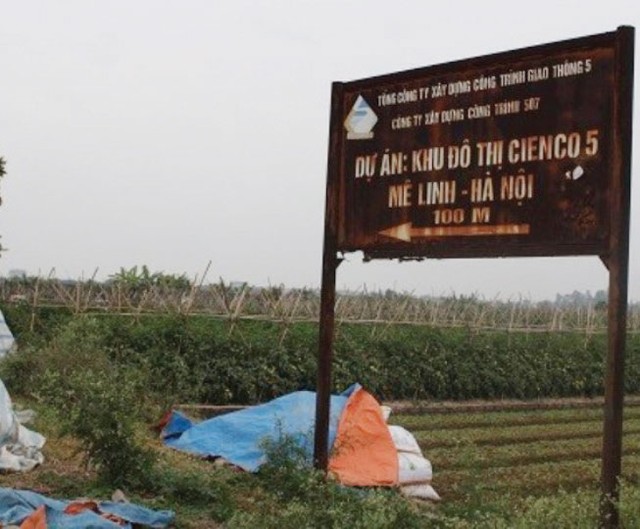 Trong khi đó, bảng chỉ dẫn vào Khu đô thị Cienco 5 là bãi hoang, người dân tận dụng trồng rau màu