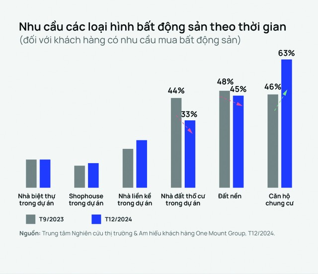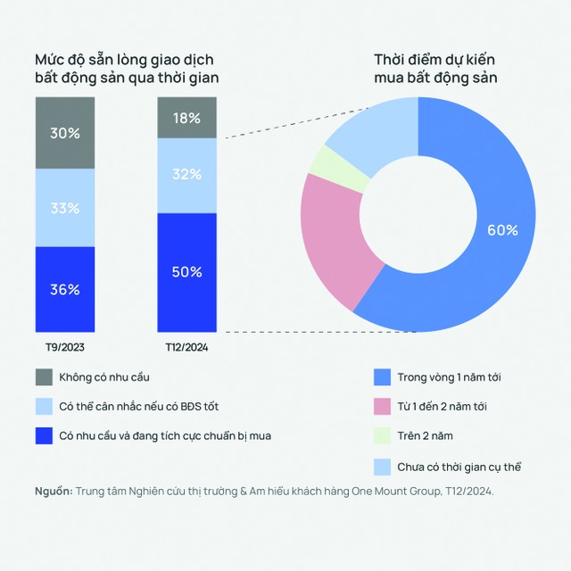 Báo cáo khảo sát của Trung tâm Nghiên cứu Thị trường và Am hiểu Khách hàng One Mount Group công bố đầu tháng 3/2025 cho thấy, số người có kế hoạch mua nhà trong năm 2025-2026 tăng 15%, trong đó 50% khách hàng đang tích cực chuẩn bị giao dịch. Xu hướng lạc quan này càng được củng cố khi có đến 60% khách hàng dự kiến sẽ mua bất động sản trong vòng một năm tới.