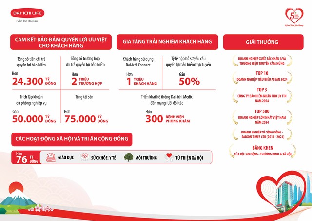 Năm 2024 ghi nhận những nỗ lực vượt bậc của Dai-ichi Life Việt Nam trong cải tiến công nghệ, đầu tư hệ sinh thái số, nâng cao chất lượng sản phẩm và dịch vụ nhằm tối ưu hóa trải nghiệm cho khách hàng: Ứng dụng Dai-ichi Connect với hơn 1 triệu khách hàng sử dụng, tỷ lệ nộp hồ sơ yêu cầu quyền lợi bảo hiểm trực tuyến đạt gần 50%; triển khai hệ thống Dai-ichi Medic đến toàn bộ mạng lưới đối tác trên 300 bệnh viện/ phòng khám, giúp rút ngắn thời gian xử lý yêu cầu thẩm định và bảo lãnh viện phí cho khách hàng; triển khai cuộc gọi Chăm sóc sức khỏe sau khi giải quyết quyền lợi bảo hiểm và được khách hàng đánh giá mức độ hài lòng đạt 4.9*/5*, nâng cấp Tài liệu bán hàng và Công cụ Lập kế hoạch bảo hiểm với nội dung dễ hiểu và dễ sử dụng; tiên phong thực hiện việc ghi âm / ghi hình trong quá trình tư vấn; ra mắt sản phẩm Bảo hiểm Chăm Sóc Sức Khỏe Toàn Cầu 24/7 với nhiều quyền lợi ưu việt và mức phí cạnh tranh, hoàn thiện hệ sinh thái số sức khỏe và hạnh phúc với Dịch vụ tư vấn sức khỏe trực tuyến giúp khách hàng và gia đình chủ động chăm sóc sức khỏe. Ngoài ra, Chuỗi hội thảo Hành trình Sức khỏe và Hạnh phúc được triển khai rộng rãi trên toàn quốc nhằm phổ cập cho khách hàng các kiến thức y khoa hữu ích để sống vui khỏe hơn mỗi ngày.