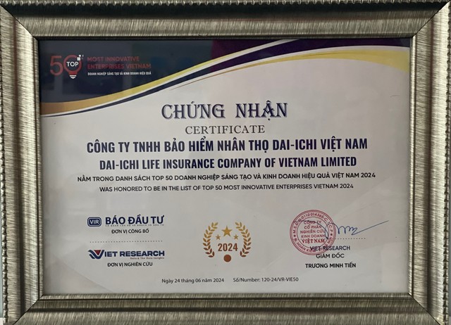Ngày 24/6/2024 tại Diễn đàn Doanh nghiệp Việt Nam - Sáng tạo và Kinh doanh hiệu quả năm 2024 được tổ chức tại Khách sạn Pullman, Hà Nội, Công ty Bảo hiểm Nhân thọ Dai-ichi Việt Nam (Dai-ichi Life Việt Nam) đã vinh dự được vinh danh ở 2 hạng mục là “Top 10 Doanh nghiệp Sáng tạo và Kinh doanh hiệu quả năm 2024 - Ngành Bảo hiểm” (VIE10- Top 10 Most Innovative Enterprises Vietnam 2024 - Insurance Industry) và “Top 50 Doanh nghiệp Sáng tạo và Kinh doanh hiệu quả năm 2024” (VIE50- Top 50 Most Innovative Enterprises Vietnam 2024), do Công ty cổ phần Nghiên cứu Kinh doanh Việt Nam (Viet Research) khảo sát, đánh giá; Báo Đầu tư là đơn vị công bố.