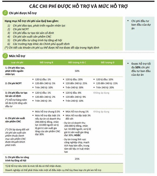 Một số loại chi phí hàng năm thuộc loại hình phát sinh trong quá trình hoạt động kinh doanh đủ điều kiện được hỗ trợ từ Quỹ như: chi phí nghiên cứu phát triển, chi phí đầu tư tạo tài sản cố định, chi phí sản xuất sản phẩm công nghệ cao..., nếu đáp ứng một số điều kiện nhất định. Mức hỗ trợ có thể khác nhau tùy thuộc vào đối tượng áp dụng và loại chi phí được hỗ trợ.