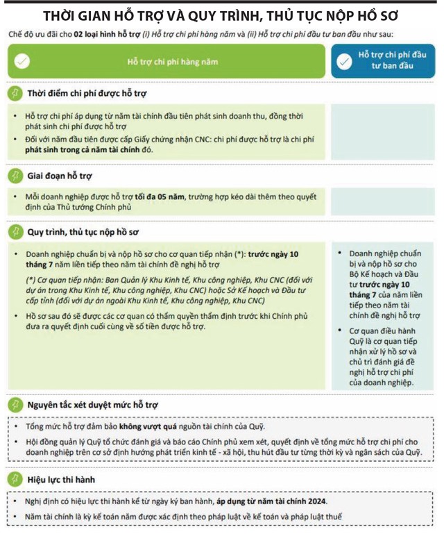 Nghị định về Quỹ hỗ trợ đầu tư có hiệu lực từ năm tài chính 2024 và mốc thời gian cụ thể để nộp hồ sơ xin hỗ trợ hàng năm là trước ngày 10/7 của năm sau năm tài chính được hỗ trợ