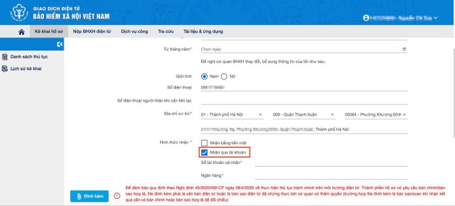 Bước 4: Kê khai vào các trường thông tin có sẵn, sau đó lựa chọn nhận qua tài khoản và điền thông tin về số tài khoản nhận chế độ, mã xác nhận rồi chọn “xác nhận”.