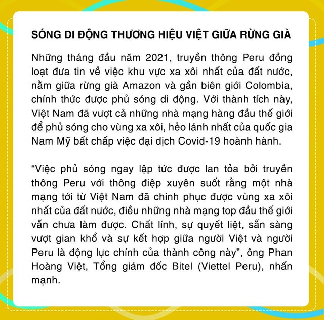 Peru là một thị trường đặc biệt của Viettel. Đây là đất nước có nền kinh tế phát triển hơn so với Việt Nam.