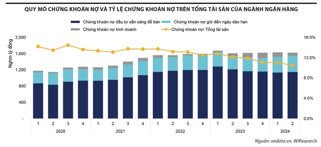 Tỷ lệ chứng khoán nợ kinh doanh của các ngân hàng giảm mạnh trong giai đoạn 2022 - 2024 cho thấy sự dịch chuyển rõ rệt trong chiến lược đầu tư.