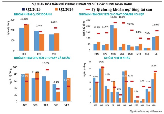 Xét theo nhóm ngân hàng, tỷ lệ chứng khoán trên tổng tài sản giảm nhiều nhất ở các ngân hàng chuyên cho vay doanh nghiệp. Những khó khăn từ thị trường trái phiếu khiến hoạt động đầu tư của nhóm ngân hàng này vào trái phiếu doanh nghiệp giảm mạnh, từ mức đỉnh gần 20% xuống khoảng 13%. Các nhóm ngân hàng khác có tỷ lệ chứng khoán trên tổng tài sản duy trì ổn định, nhất là nhóm ngân hàng quốc doanh, vốn thường giữ quan điểm thận trọng đối với danh mục đầu tư.