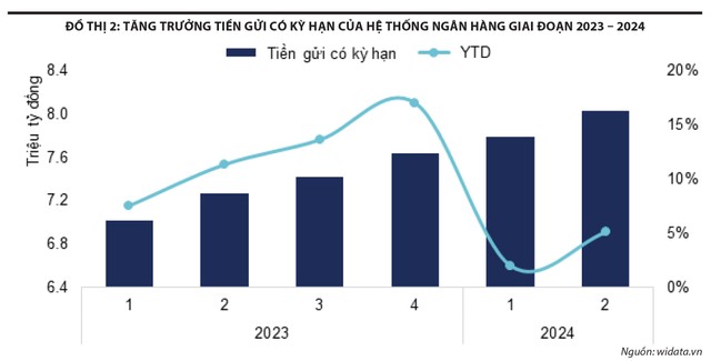 Tiền gửi có kỳ hạn dài đang bị rút ra đáng kể khỏi hệ thống ngân hàng. Số liệu cho thấy, trong năm 2024, tiền gửi có kỳ hạn đã tăng trưởng thấp hơn rất nhiều so với mức bình quân của những năm trước. Cá biệt, ở một số ngân hàng như Vietcombank, tiền gửi có kỳ hạn đến cuối năm 2024 thậm chí còn sụt giảm so với cùng kỳ năm trước. Nguyên nhân có thể là do nhiều người dân, doanh nghiệp rút tiền tiết kiệm để chuyển sang các kênh đầu tư có khả năng sinh lời tốt hơn (như chứng khoán, bất động sản hoặc vàng).