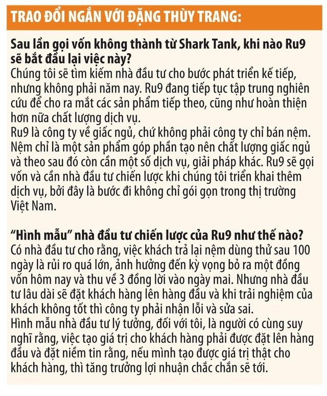 Hai tháng sau khi thành lập Ru9, Trang bị các nhà đầu tư trong chương trình Shark Tank Việt Nam từ chối rót vốn phần vì công ty này còn non trẻ, phần vì ưu tiên trong kinh doanh của hai phía đều khác nhau.