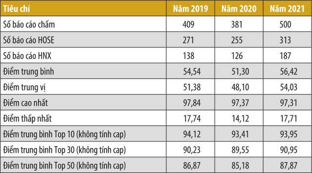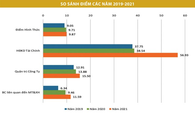 Điểm số năm 2021 đã có mức tăng khá so với năm 2020, điểm trung bình và trung vị đã cao hơn mức điểm năm 2019 - là năm chưa bị ảnh hưởng của dịch Covid. Có thể thấy, doanh nghiệp đã có sự thích ứng trong năm 2021 và cải thiện công tác soạn thảo báo cáo thường niên.