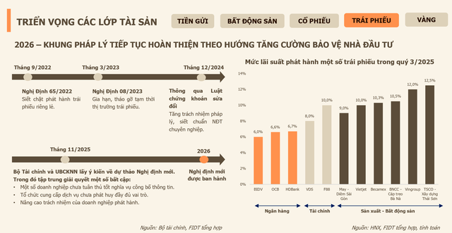 Trái phiếu, thông điệp của FIDT khuyến nghị nhà đầu tư nên quan tâm trở lại kênh này trong năm 2026. Nguyên nhân là vì thị trường đã được thanh lọc. Các doanh nghiệp yếu kém đã bị loại bỏ, những đơn vị còn lại phát hành được trái phiếu hiện nay đều có sức khỏe tài chính ổn định. Khung pháp lý cũng đã bảo vệ nhà đầu tư tốt hơn. Đây là kênh có mức sinh lời tốt hơn tiền gửi tiết kiệm.