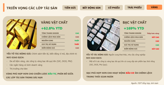 Vàng: Vẫn là kênh phòng thủ (trú ẩn) cần thiết trong bối cảnh địa chính trị bất định (do dự). Tuy nhiên, dư địa tăng giá mạnh của tài sản này không còn nhiều.