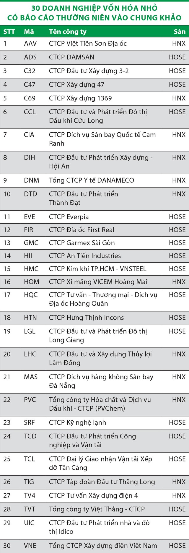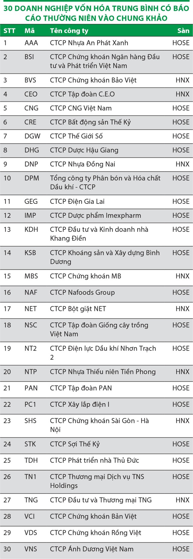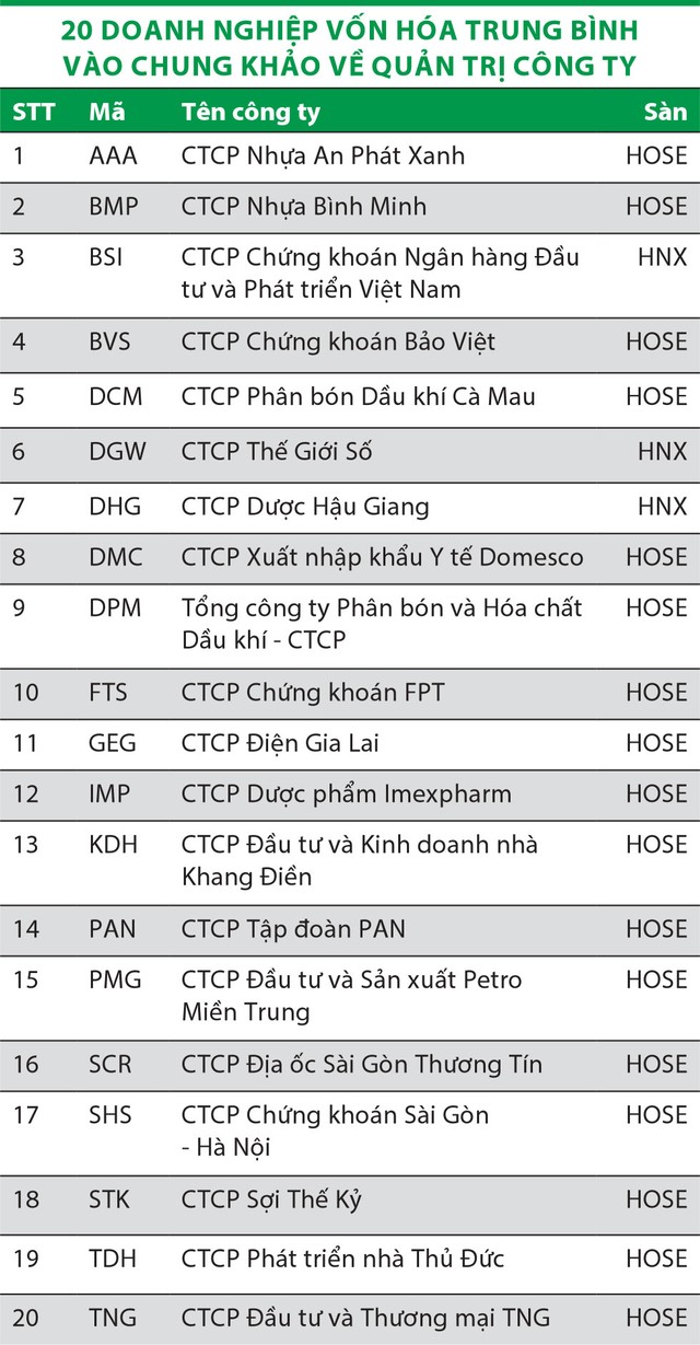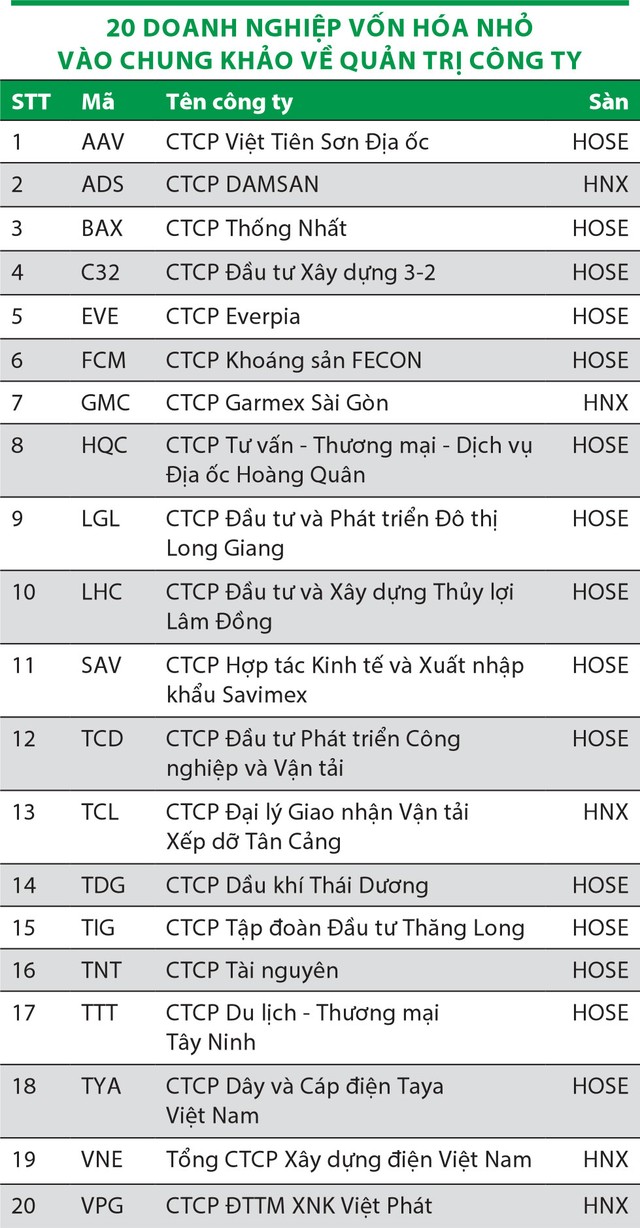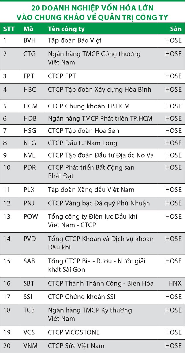 Ở hạng mục báo cáo quản trị công ty, 60 doanh nghiệp có nội dung báo cáo quản trị công ty tốt nhất được chọn vào vòng chung khảo, phân theo từng nhóm vốn hóa, mỗi nhóm 20 doanh nghiệp (xem bảng).