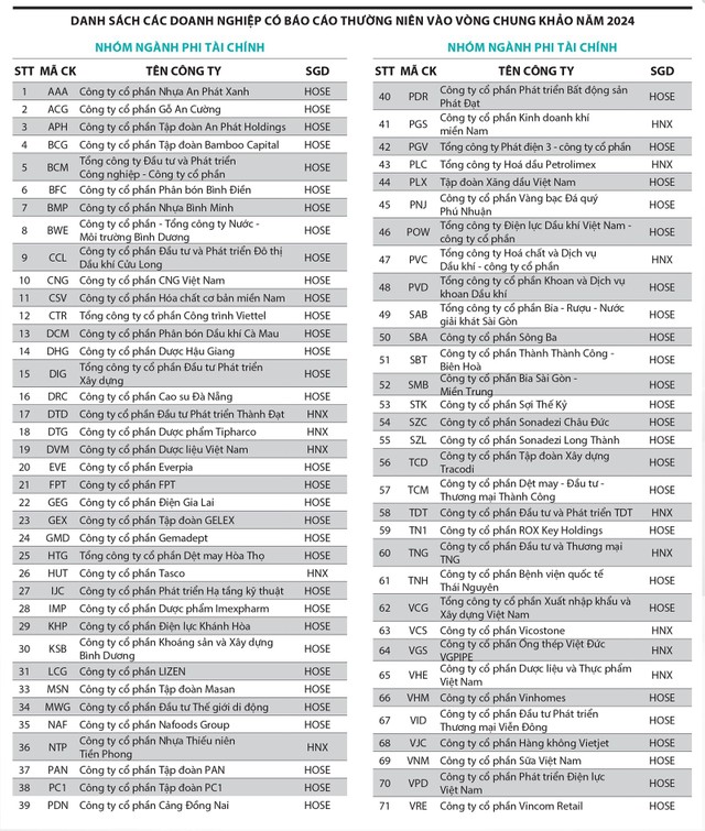 96 doanh nghiệp có báo cáo thường niên (BCTN) tốt nhất được bình chọn vào vòng chung khảo, gồm 25 doanh nghiệp thuộc nhóm ngành tài chính và 71 doanh nghiệp thuộc nhóm ngành phi tài chính (xem danh sách, được xếp theo thứ tự ABC của mã chứng khoán, không phải thứ tự xếp hạng).
