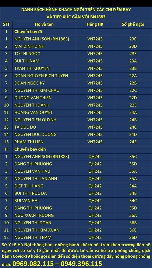 Trưa 3/2, Sở Y tế Hà Nội cung cấp danh sách những hành khách ngồi trên 2 chuyến bay có tiếp xúc gần với BN1883 mắc COVID-19.