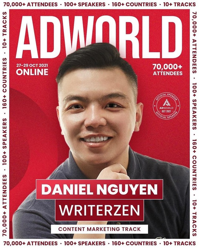 Daniel Nguyễn, CEO của WriterZen vinh hạnh trở thành diễn giả người Việt duy nhất tại Ad World Conference 2021, hội nghị quảng cáo lớn nhất toàn cầu, nơi quy tụ hơn hơn 100 chuyên gia đầu ngành trên thế giới như Phó chủ tịch Ogilvy Rory Sutherland, Nhà sáng lập Akimbo Seth Goldin cùng các đại diện từ những "gã khổng lồ công nghệ" Google, Facebook và Microsoft.