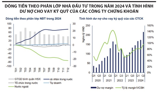 Xét về tỷ lệ dư nợ cho vay ký quỹ/vốn chủ sở hữu các công ty chứng khoán, tỷ lệ này vẫn thấp hơn đáng kể so với mức 1,4 lần của năm 2022, trong khi các công ty chứng khoán tiếp tục có động thái tăng vốn. Tuy nhiên, việc nguồn vốn ký quỹ tăng mạnh trong 2 quý cuối năm 2024 có khả năng tạo ra tác động trái chiều tới xu hướng VN-Index, bởi động lực cho các giao dịch ngắn hạn và khả năng lan tỏa xu hướng sẽ phụ thuộc nhiều hơn vào dòng tiền mới gia nhập thị trường, trong khi khả năng mở rộng tức thời từ nguồn vốn vay bị thu hẹp. Mặt khác, rủi ro “call margin” (phải bổ sung tài sản ký quỹ) chéo cần được lưu ý trong trường hợp thị trường biến động mạnh, đặc biệt khi giao dịch bán ròng của khối ngoại thường tập trung ở các cổ phiếu vốn hóa lớn.