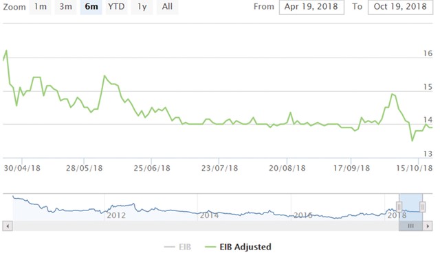 Tại ngày 17/10, giá cổ phiếu EIB trên thị trường được giao dịch dưới mốc 14.000 đồng/cổ phiếu, thấp hơn mức giá khởi điểm đưa ra, nên không hấp dẫn nhà đầu tư. Từ đó đến nay, EIB vẫn trong xu hướng giảm.