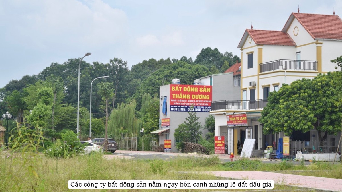 Tại xã Tiền Yên, nhà đầu tư không khó để bắt gặp các văn phòng môi giới địa ốc. Riêng tại khu vực xung quanh các lô đất đấu giá đã có ít nhất 3 công ty đang hoạt động hết công suất để mời chào khách. Những tấm biển quảng cáo của các doanh nghiệp này được phủ kín khắp nơi với đủ mọi kích thước, trải dài từ đầu đến cuối khu Lòng Khúc.