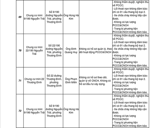 Còn quận Thanh Xuân có những công trình vi phạm PCCC như: Tòa nhà 24 T3 số 6 Lê Văn Thiêm của Công ty CP phát triển Thanh Xuân; Tòa nhà Zen Tower, ngõ 1 Khuất Duy Tiến Công ty CPĐTPT số 8 làm chủ đầu tư....