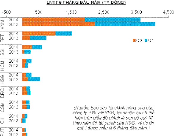 VN30 có 2 CTCK là CTCP Chứng khoán Sài Gòn (SSI) và CTCP Chứng khoán TP. HCM (HSC - mã HCM), thì cả 2 công ty đều có sự tăng trưởng vượt bậc về lợi nhuận. Trong đó, SSI (công ty mẹ) có lợi nhuận trước thuế gấp 2,4 lần so với 6 tháng đầu năm 2013, đạt 597 tỷ đồng. Riêng quý II, con số này là 294 tỷ đồng, gấp gần 5 lần cùng kỳ năm trước. Doanh thu tự doanh của SSI tăng rất mạnh, nguyên nhân một phần được cho là Công ty đã mua được khối lượng lớn cổ phiếu ở mức giá thấp vào ngày 8/5/2014.