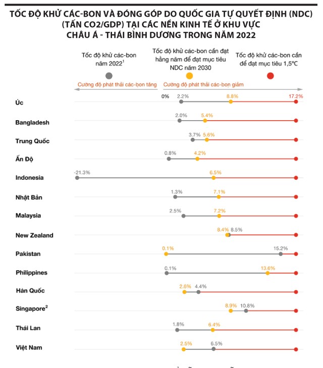 Báo cáo Chỉ số Kinh tế Net Zero 2023 của PwC cho thấy, dù đã đạt được những tiến bộ nhất định về khử các-bon trên toàn khu vực, với việc đạt mức tăng gấp đôi (2,8%) vào năm 2022, song khu vực châu Á - Thái Bình Dương cần nỗ lực thu hẹp khoảng cách giữa các nước trong khu vực. Trong bối cảnh đó, Việt Nam hiện nằm trong Top 5 nền kinh tế khu vực châu Á - Thái Bình Dương đạt được tốc độ khử các-bon cần thiết để đáp ứng mức Đóng góp do quốc gia tự quyết định (NDC), với tỷ lệ 6,5%, đứng sau Singapore (với 10,8%), New Zealand (8,5%) và đứng trên Hàn Quốc (4,4%)... Tỷ lệ khử các-bon 6,5% mà Việt Nam đạt được vào năm 2022 vượt xa mức 2,5% cần thiết để đạt được mục tiêu NDC.